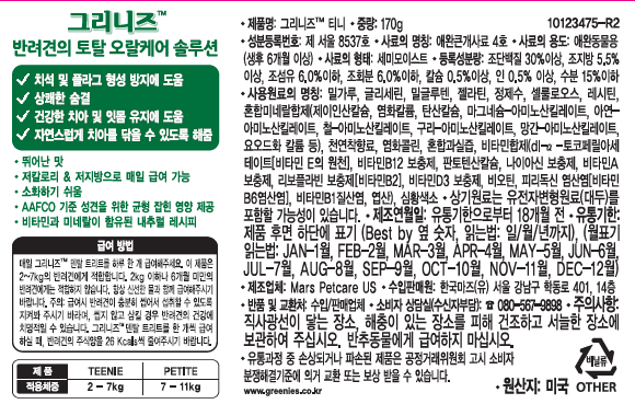 | 품명 및 모델명 | 그리니즈 티니 | 인증/허가 사항 | 사료관리법에 따른 성분등록번호 : 컨텐츠 참조 |