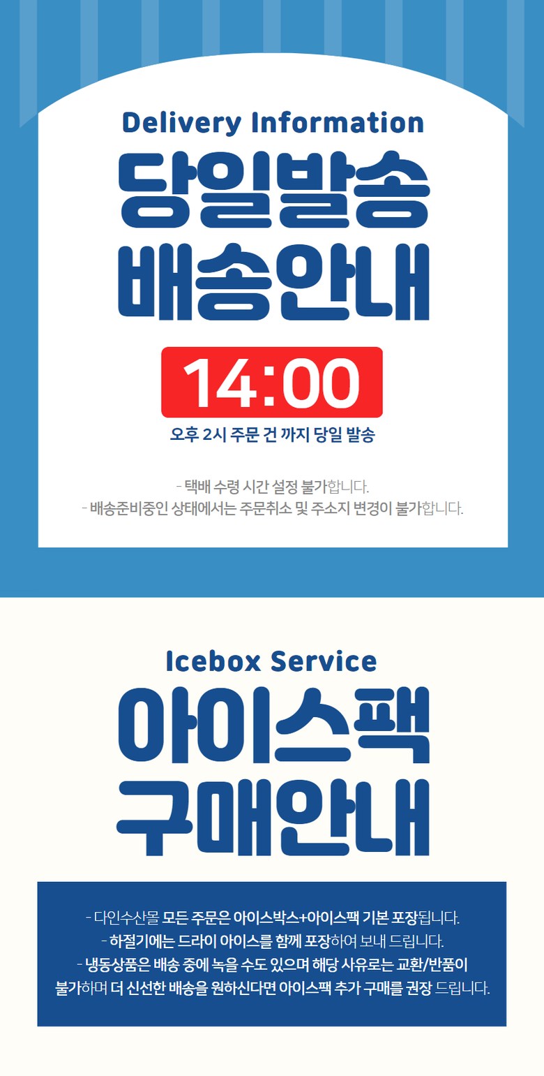 | 배송방법 | 신선/냉장/냉동 | 배송비 | 무료배송 · 도서산간 추가 배송비 - 제주 지역: 3,500원 - 도서산간 지역: 5,000원 |