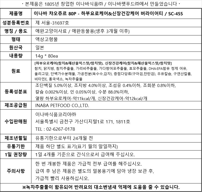 | 품명 및 모델명 | 이나바 챠오츄르 80P - 하부요로케어 & 신장건강케어 버라이어티 / SC-455 | 인증/허가 사항 | 사료관리법에 따른 성분등록번호 : 컨텐츠 참조 |