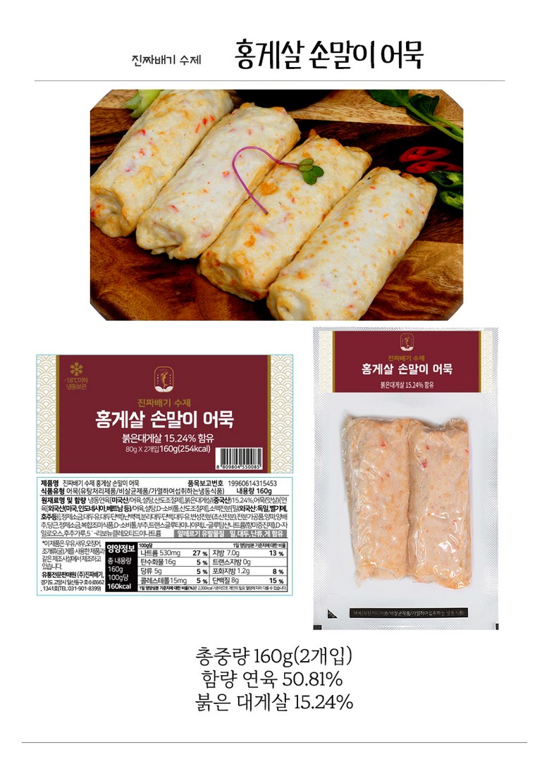 | 생산자 및 소재지 | 주식회사 진짜배기, 경기도 고양시 일산동구 장항동 호수로 662, 대한민국 | 제조연월일, 소비기한 또는 품질유지기한 | 최근제조, 제조일로부터 냉동 6개월~2년 |