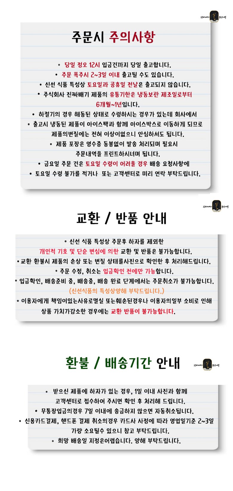 | 배송방법 | 신선/냉장/냉동 | 배송비 | 3,000원 - 10,000원 이상 구매 시 무료배송 - 도서산간 지역 배송불가 |