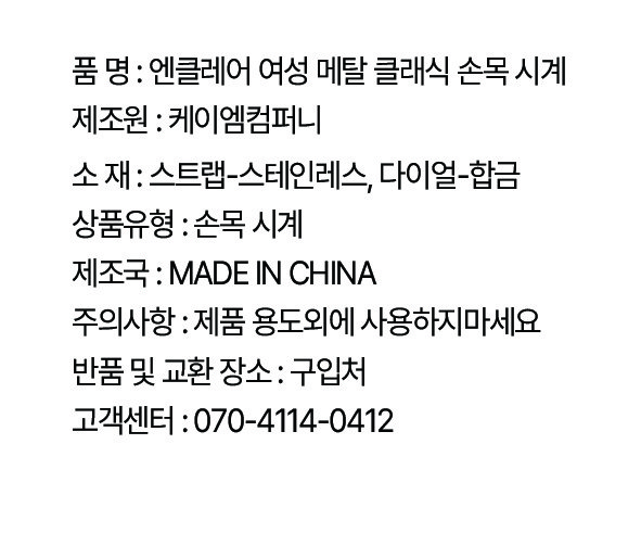 | 치수 | 다이얼 직경:25mm/ 두께: 7mm/ 스트랩 폭: 12mm/ 둘레길이: 18cm | 제조자(수입자) | 케이엠컴퍼니 / 업체미제공 |