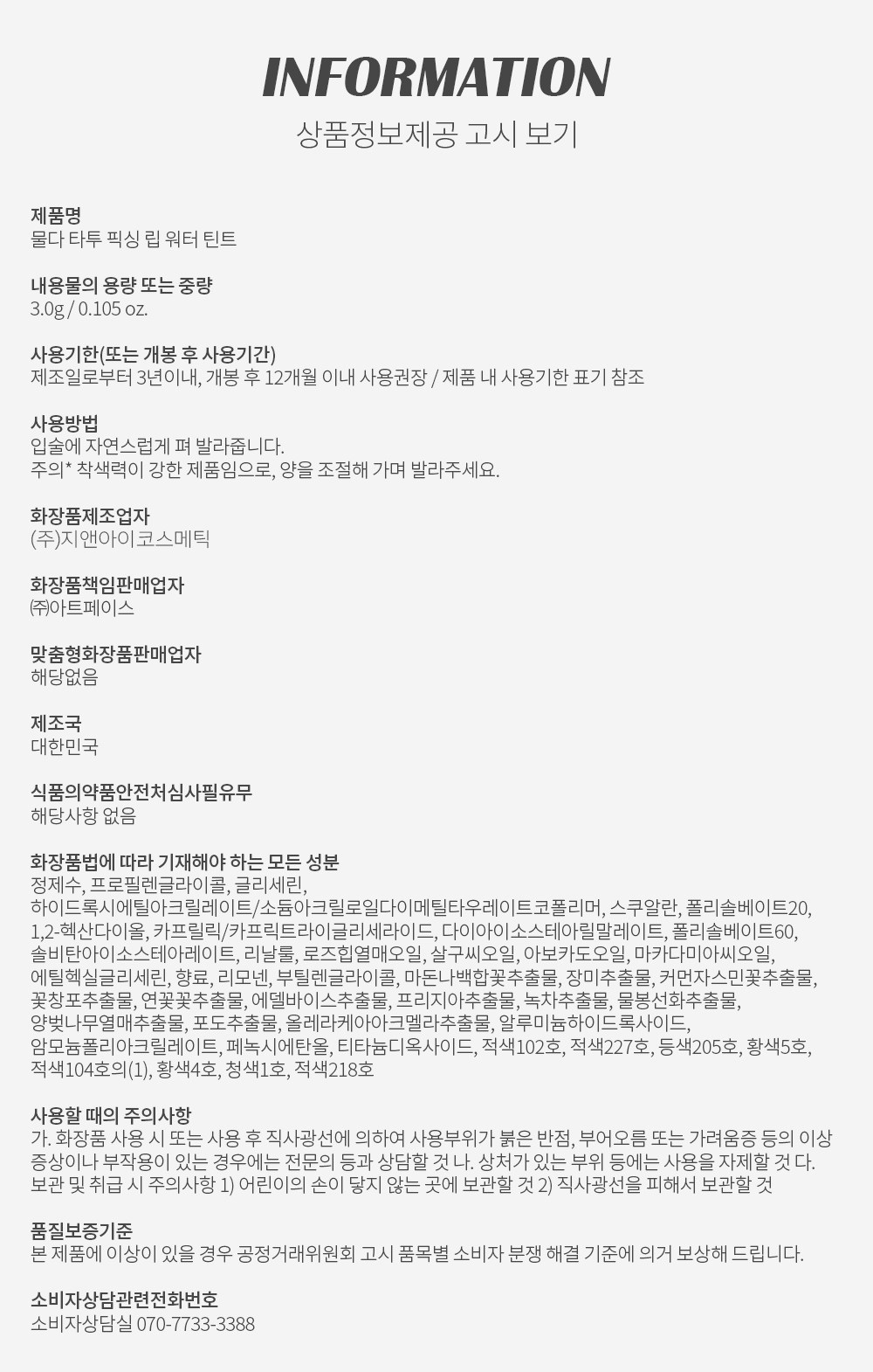 | 화장품제조업자, 화장품책임판매업자 및 맞춤형화장품판매업자 | (주)지앤아이코스메틱 / (주)아트페이스 | 제조국 | 대한민국 |