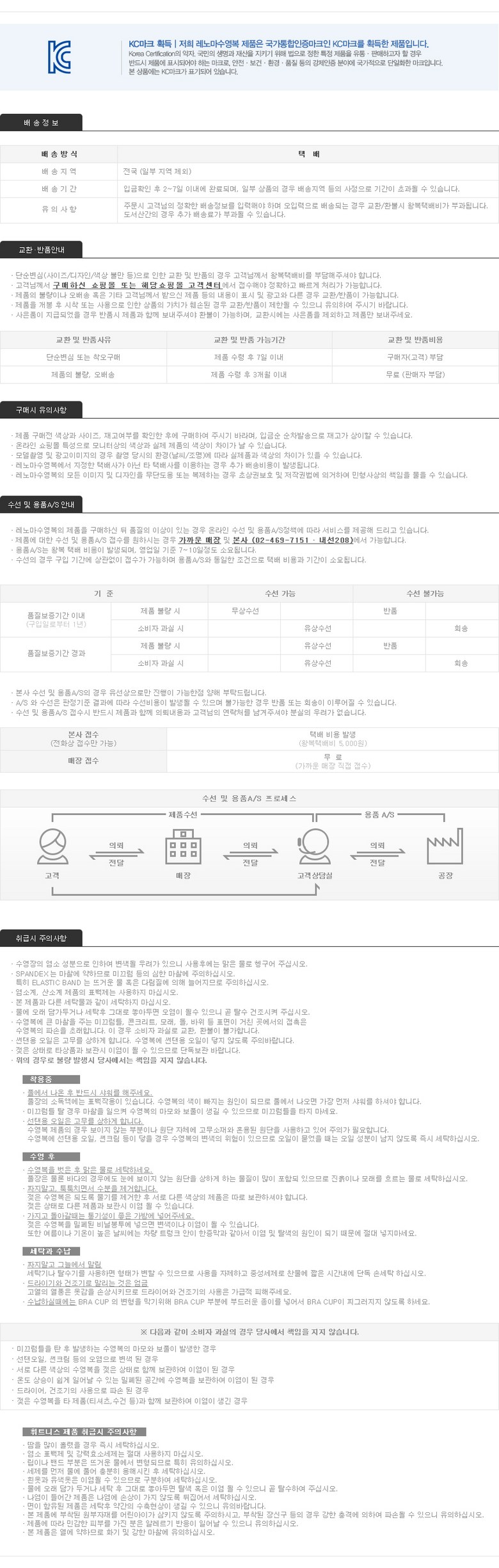 | 교환/반품 신청 기준일 | ㆍ단순변심에 의한 교환/반품은 제품 수령 후 7일 이내까지, 교환/반품 제한사항에 해당하지 않는 경우에만 가능 (배송비용과 교환/반품 비용 왕복배송비 고객부담) ㆍ상품의 내용이 표시·광고의 내용과 다른 경우에는 상품을 수령한 날부터 3개월 이내, 그 사실을 안 날 또는 알 수 있었던 날부터 |