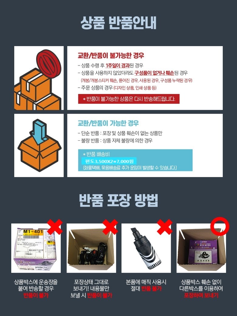 - ㆍ교환/반품에 관한 일반적인 사항은 판매자가 제시사항보다 관계법령이 우선합니다.