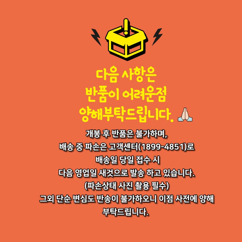 - ㆍ모니터 해상도의 차이로 인해 색상이나 이미지가 실제와 달라, 고객이 단순 변심으로 교환/반품을 무료로 요청하는 경우