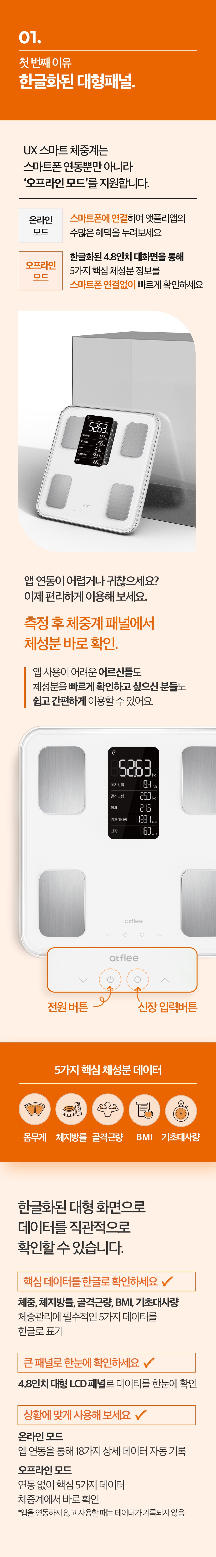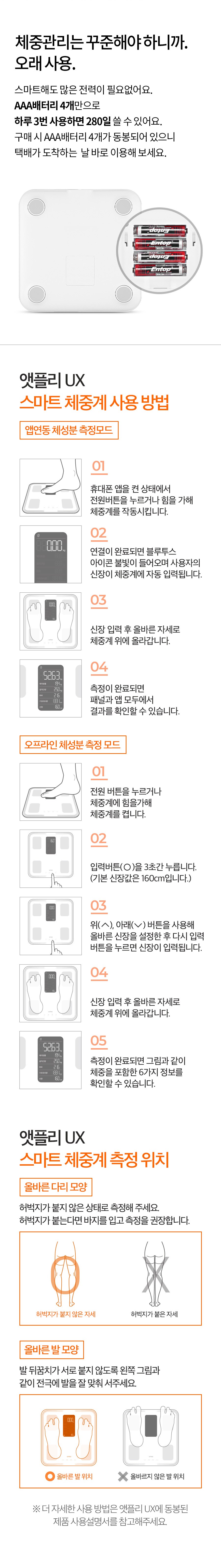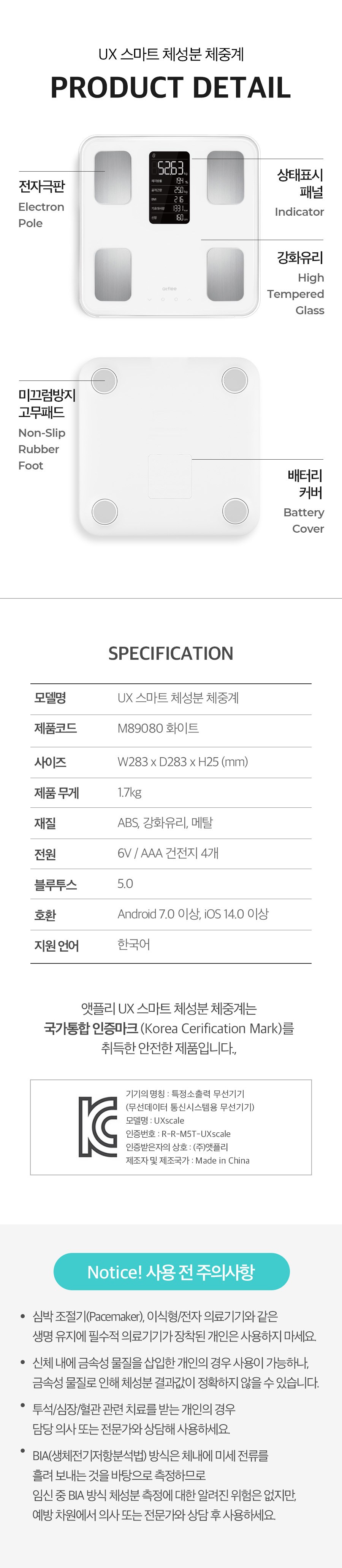 | 품명 및 모델명 | 앳플리 UX 스마트 체중계 / UXscale | KC 인증정보 | 본품 : R-R-M5T-UXscale / 건전지 : B053R5079-21002 |