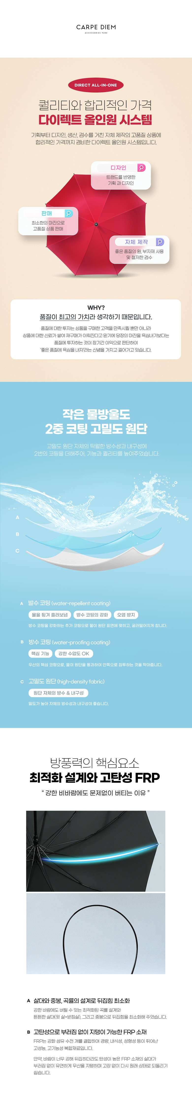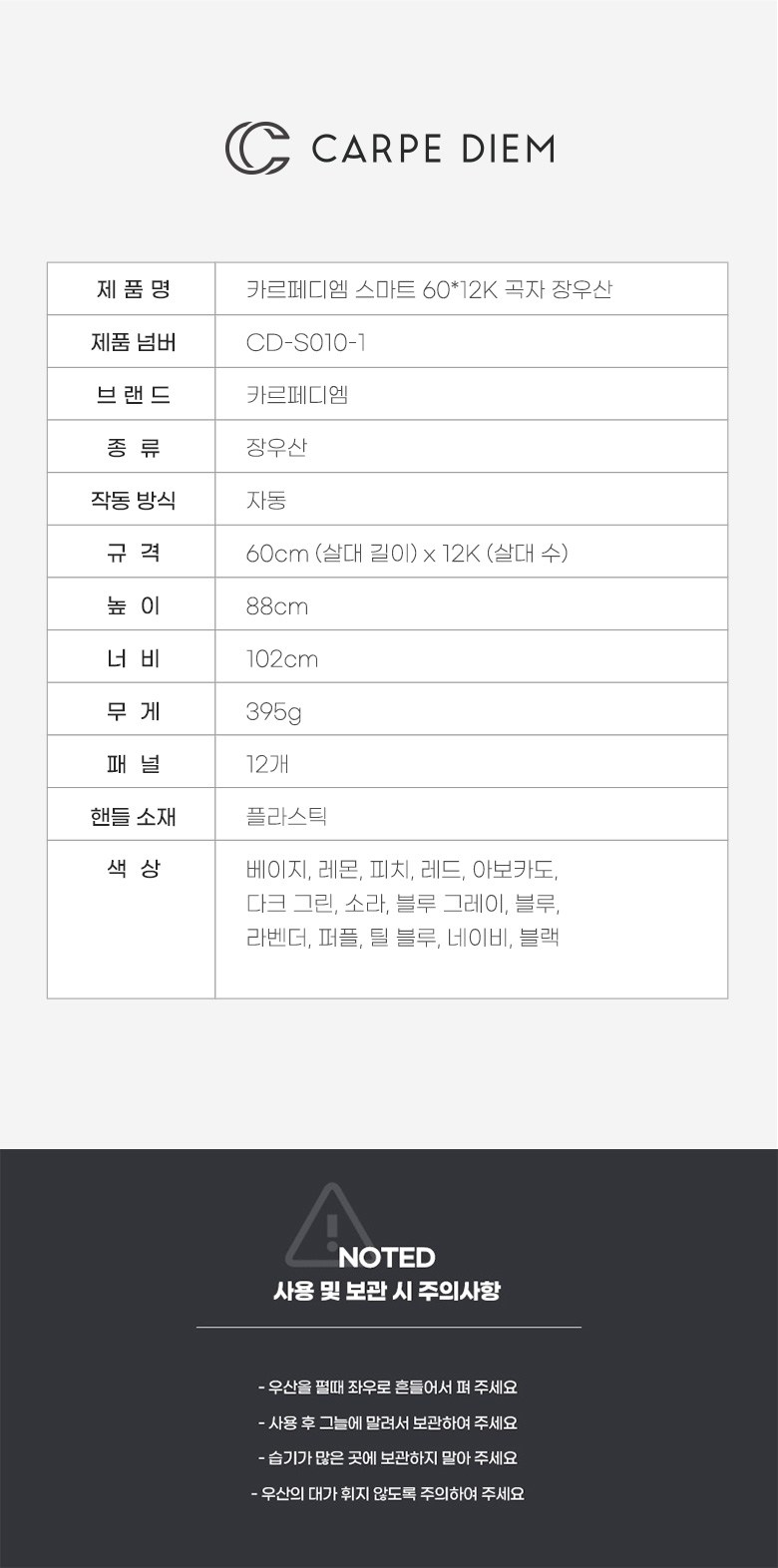 | 종류 | 일반식 자동우산 | 소재 | 폴리에스터, 살대: 컨텐츠참조, 핸들: 컨텐츠참조 |