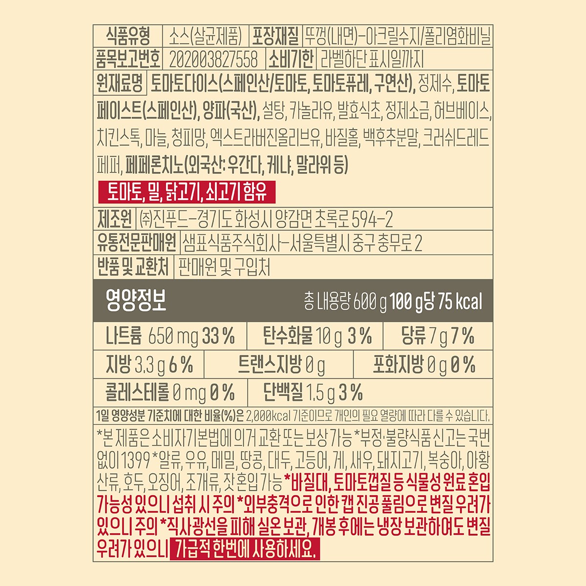 | 제품명 | 시칠리아 페페론치노 아라비아따 파스타소스 | 식품의 유형 | 컨텐츠 참조 |
