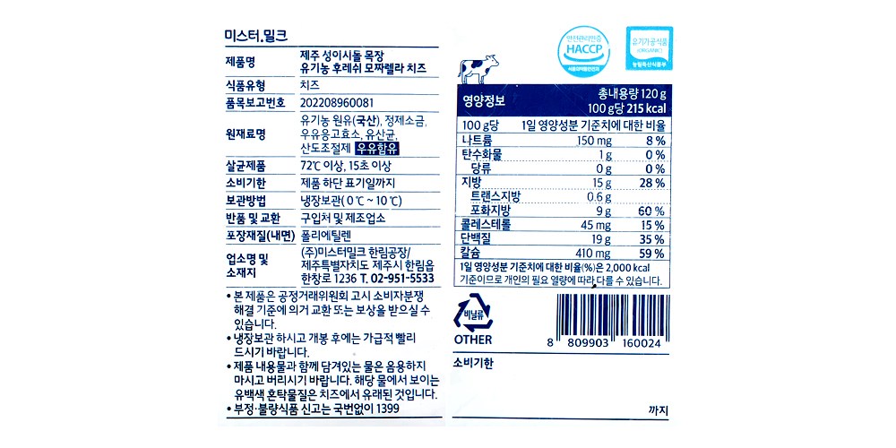 성이시돌 목장 원유로 만든 모짜렐라 치즈
