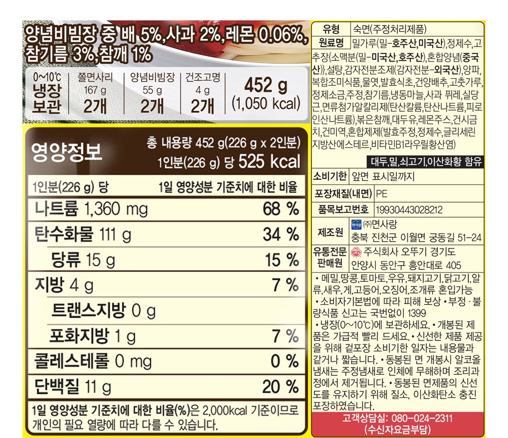 | 포장단위별 내용물의 용량(중량), 수량 | 452g x 1개입 x 4개 | 원재료명 및 함량 | 컨텐츠 참조 |