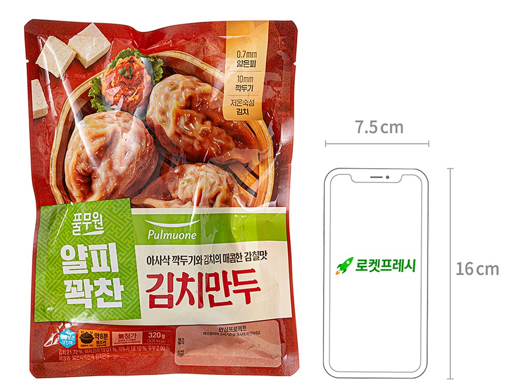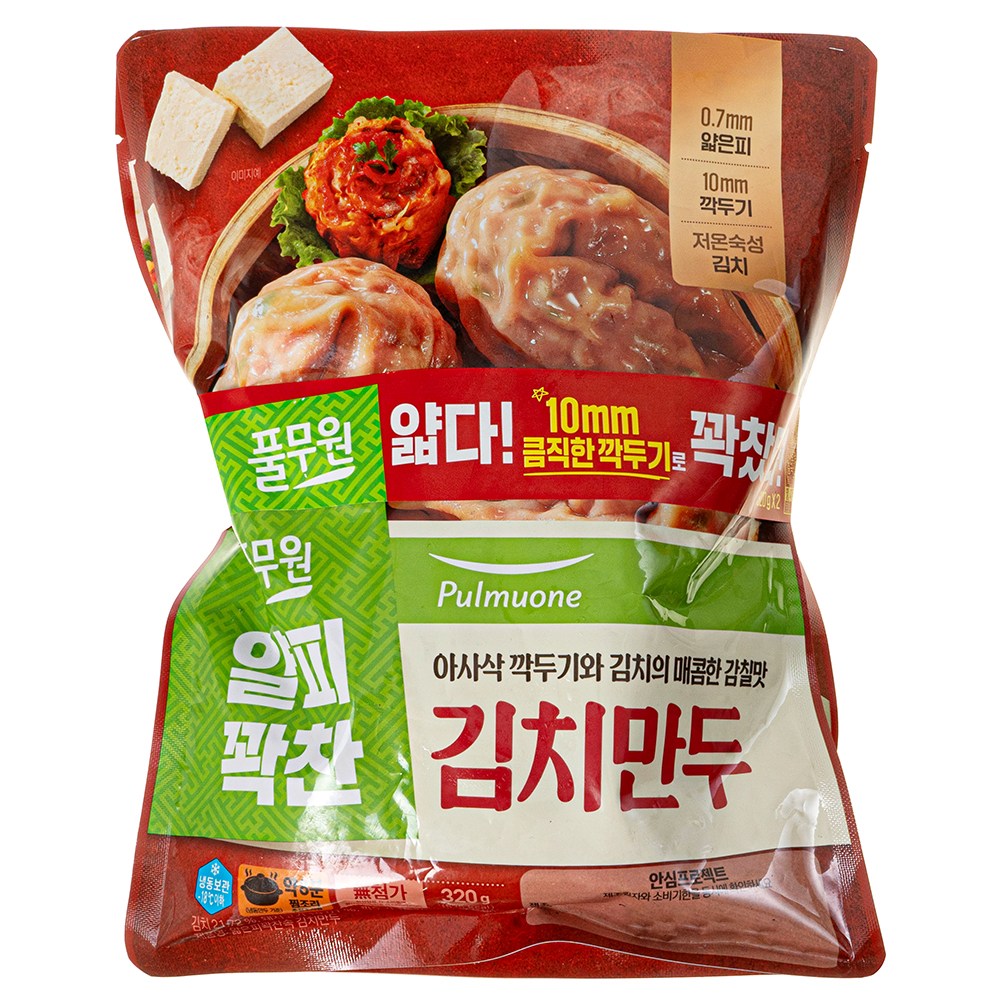얇고 쫄깃한 만두피를 자랑하는 풀무원 김치만두예요. 한입 베어 물면, 큼직한 깍두기와 김치가 아삭하게 씹히며 매콤한 맛을 선사하죠. 돼지고기의 구수한 육즙, 부추와 당면의 고소한 감칠맛까지 풍성하게 즐겨보세요. 에어프라이어나 전자레인지로도 조리할 수 있어 간편해요.