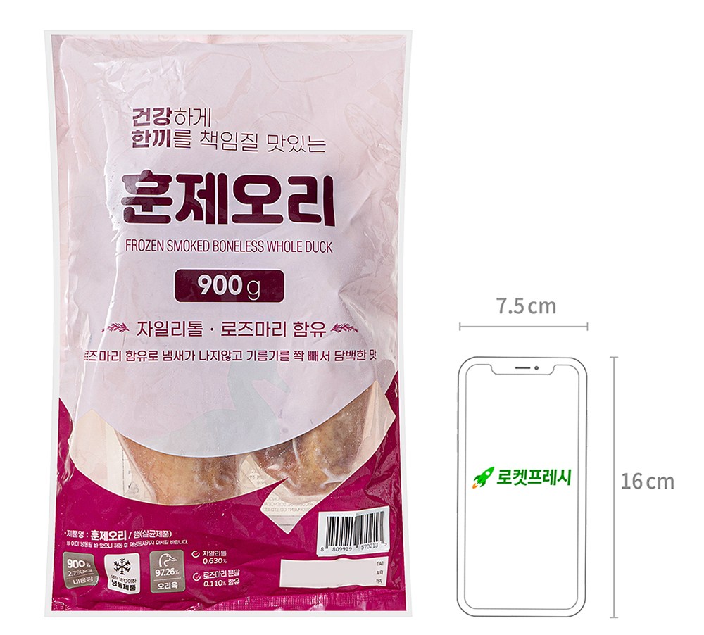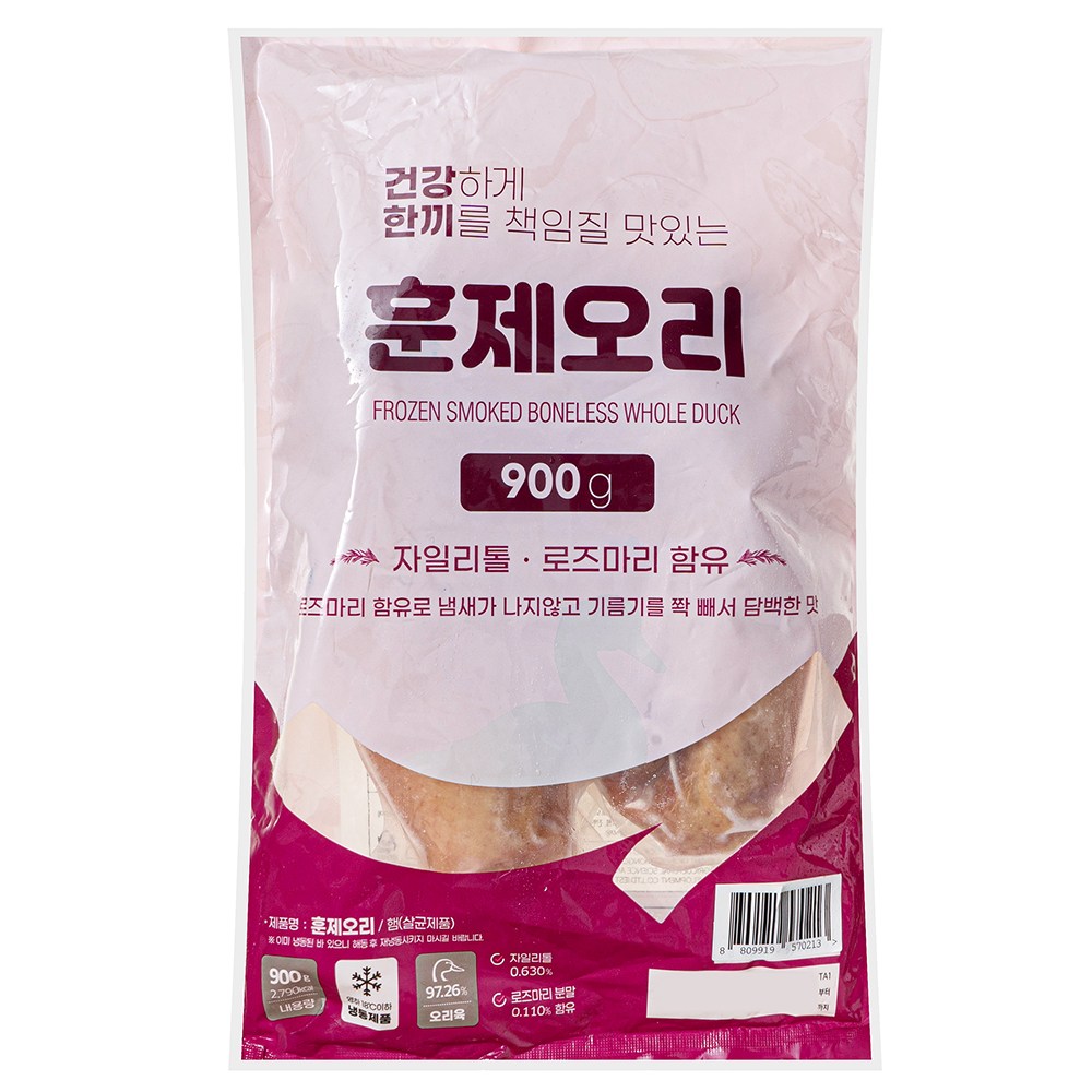 큼직한 크기로 즐기는 훈제오리예요. 부드러운 육질과 촉촉한 육즙이 돋보이는 별미죠. 자일리톨, 로즈마리분말을 함유해 고소하면서 담백한 감칠맛이 살아있답니다. 그대로 쪄서 즐기셔도 좋고, 먹기 좋게 잘라 구워 드셔도 좋아요. 전자레인지나 찜기로 조리하면 완성되니 간편해요.
