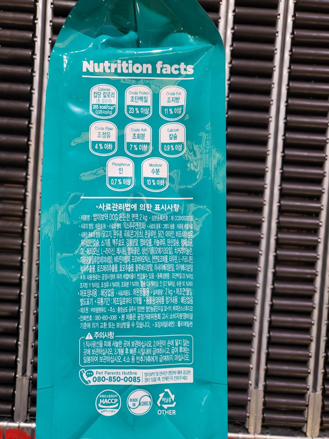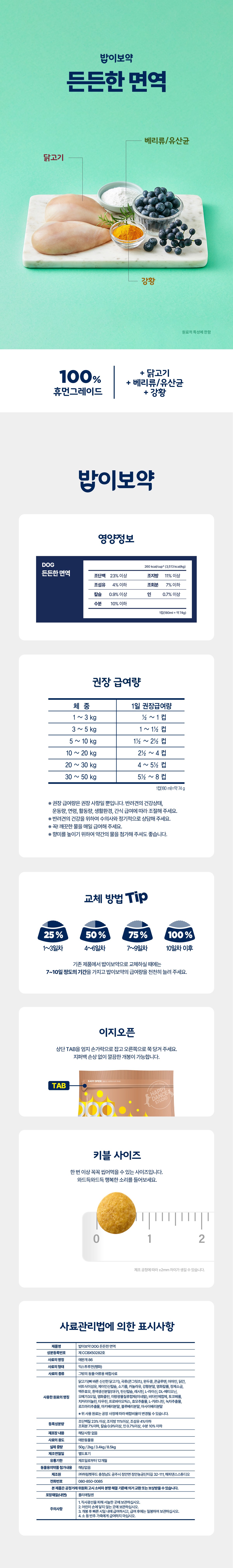 | 품명 및 모델명 | 밥이보약 DOG 든든한 면역 | 인증/허가 사항 | 사료관리법에 따른 성분등록번호 : 컨텐츠 참조 |
