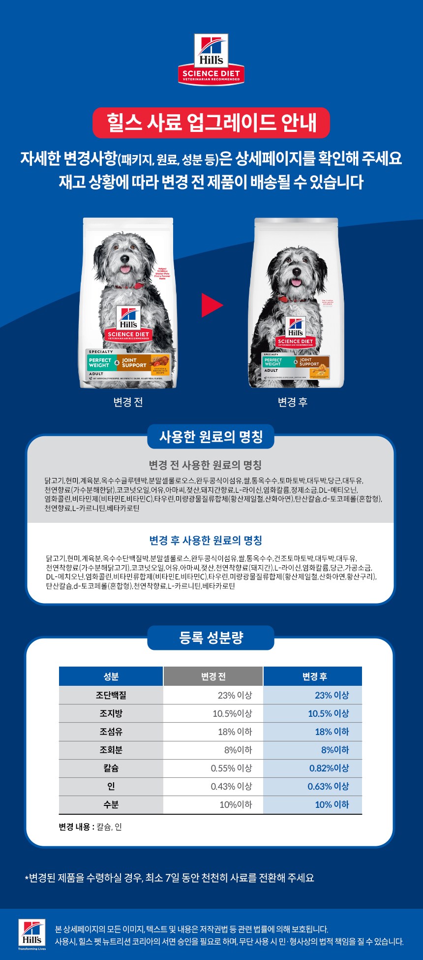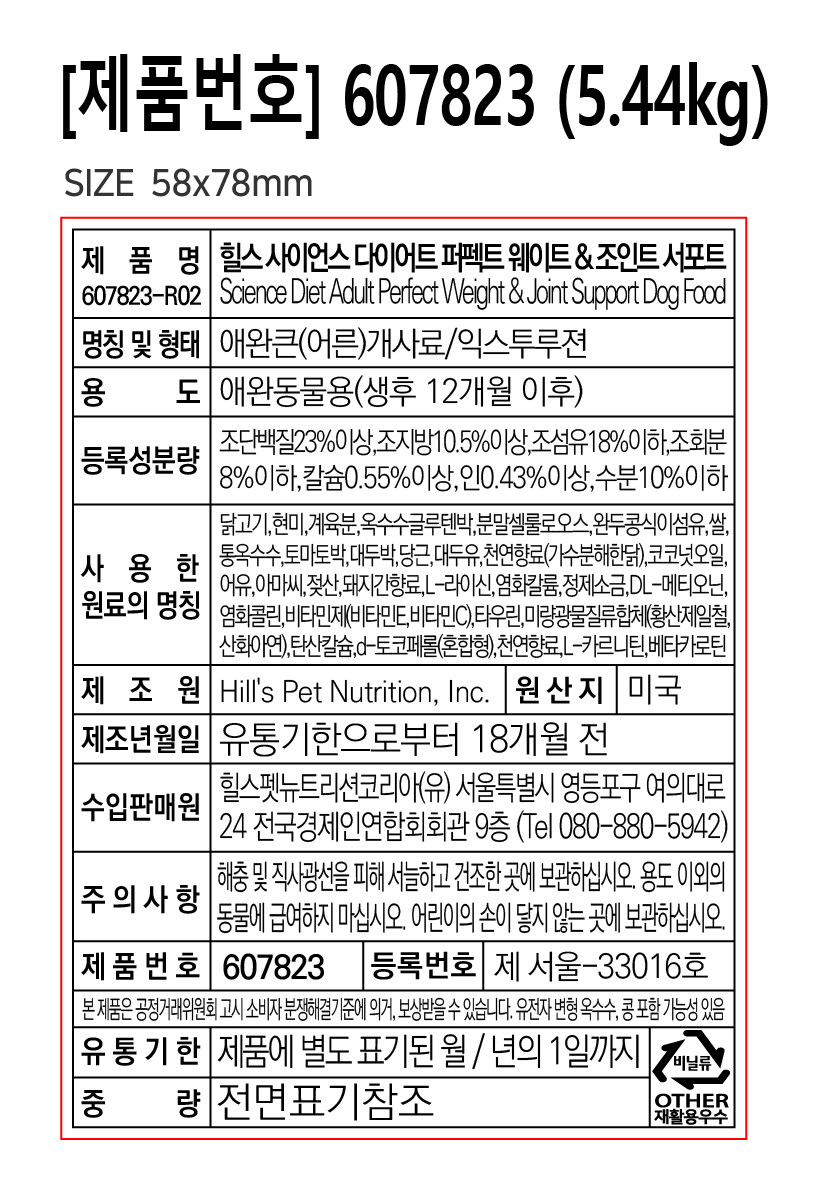 | 품명 및 모델명 | 힐스 사이언스 다이어트 퍼펙트 웨이트 & 조인트 서포트 | 인증/허가 사항 | 사료관리법에 따른 성분등록번호 : 컨텐츠 참조 |