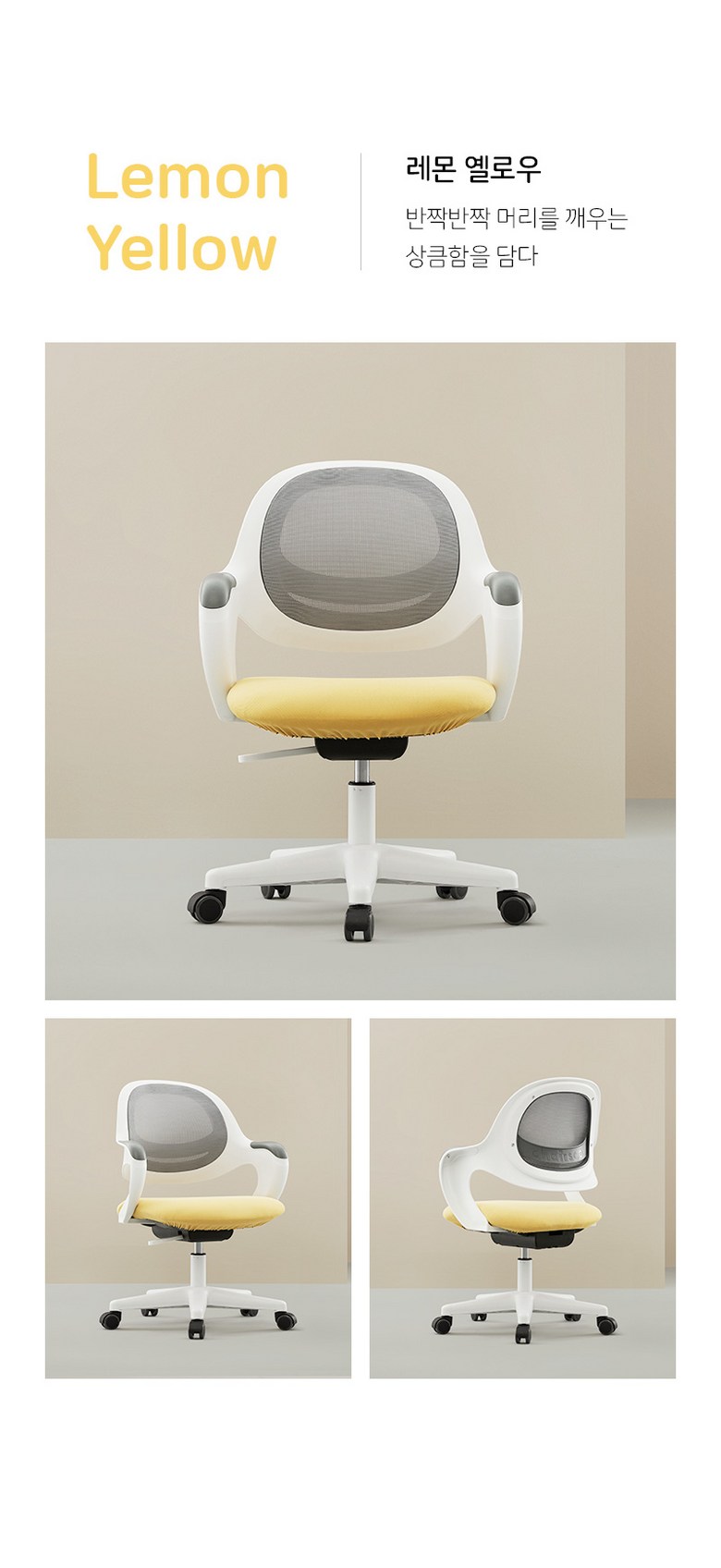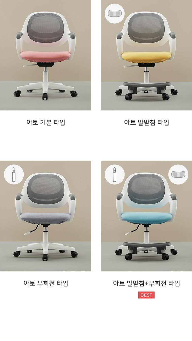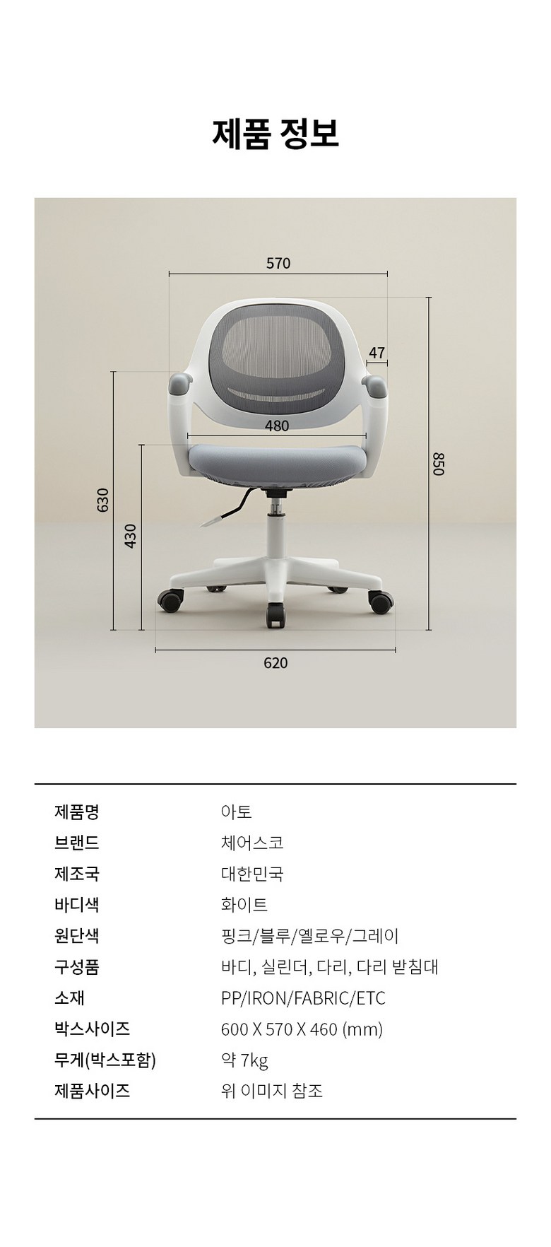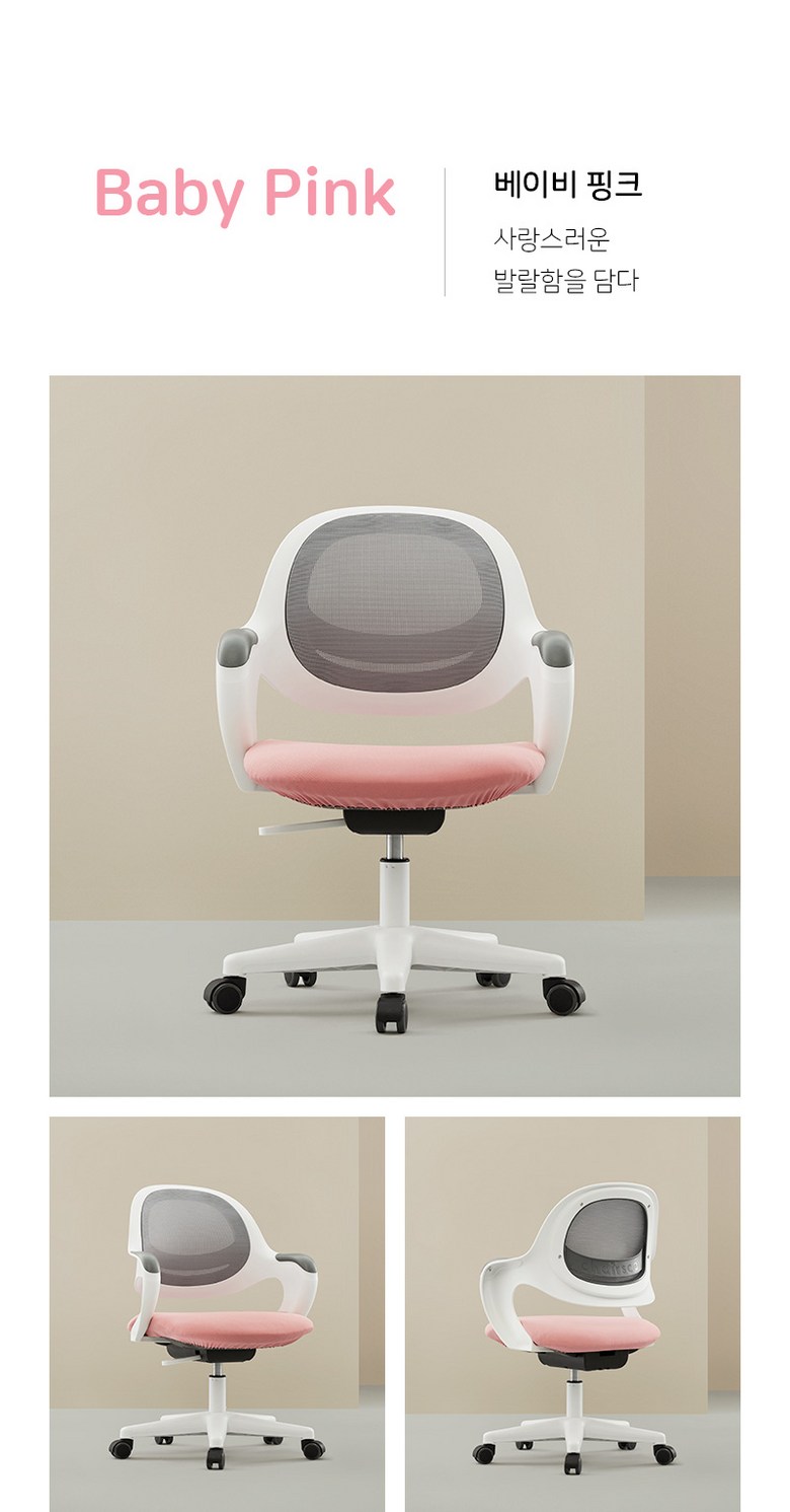 | 색상 | 메탈그레이, 베이비핑크, 스카이블루, 레몬옐로우 | 재질 | 폴리프로필렌, 폴리우레탄, 메쉬 소재, 패브릭 소재 |