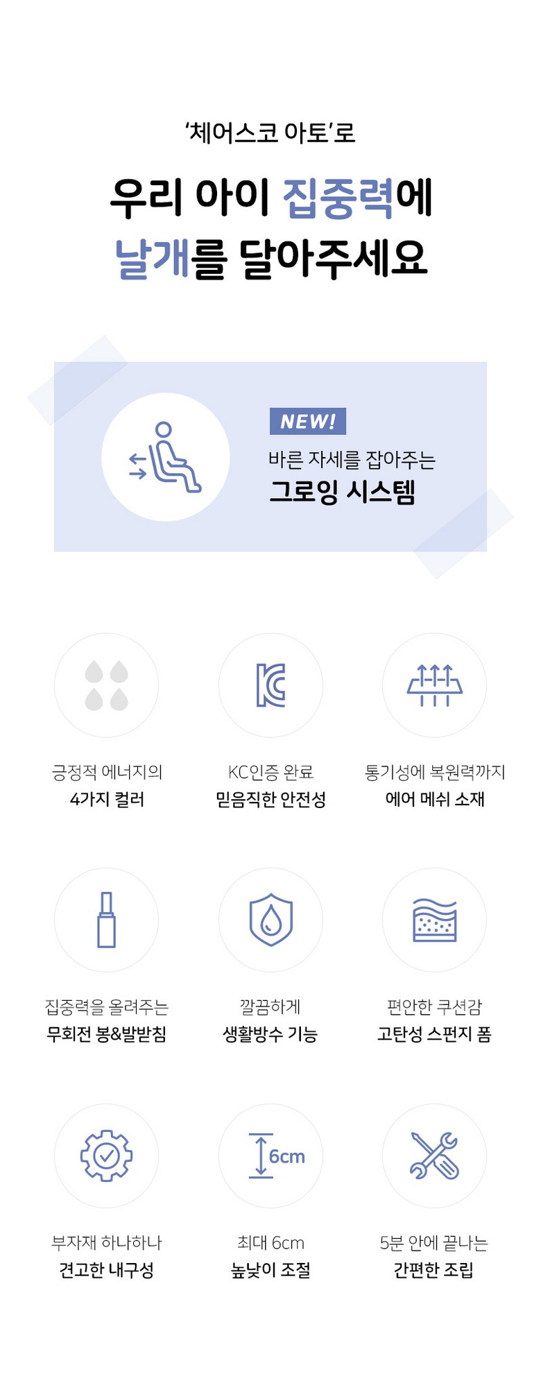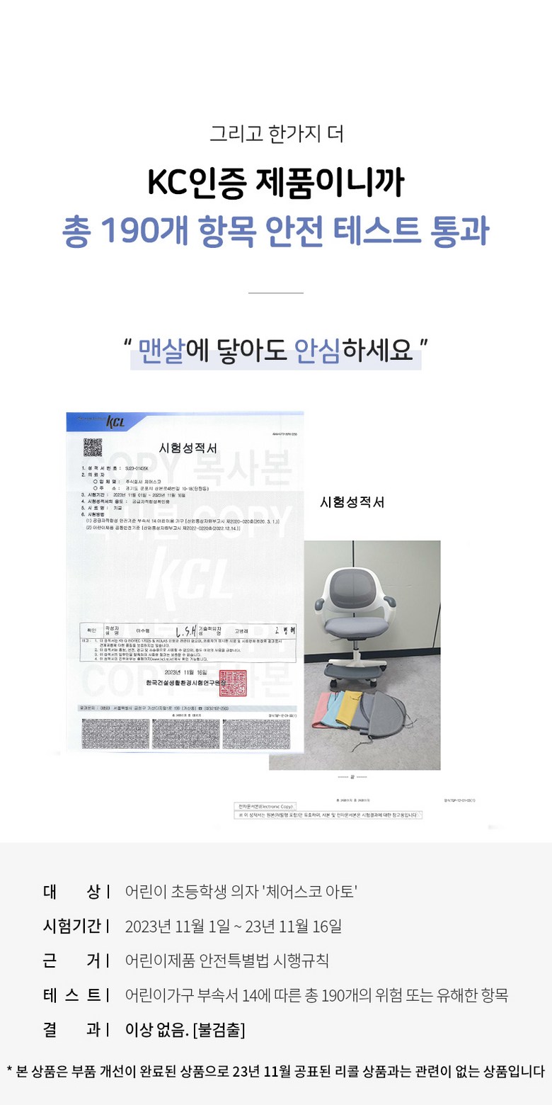 | 품명 및 모델명 | 체어스코 아토 의자 | KC 인증정보 | 어린이제품 안전 특별법에 따른 안전인증∙안전확인∙공급자적합성확인대상어린이제품 |