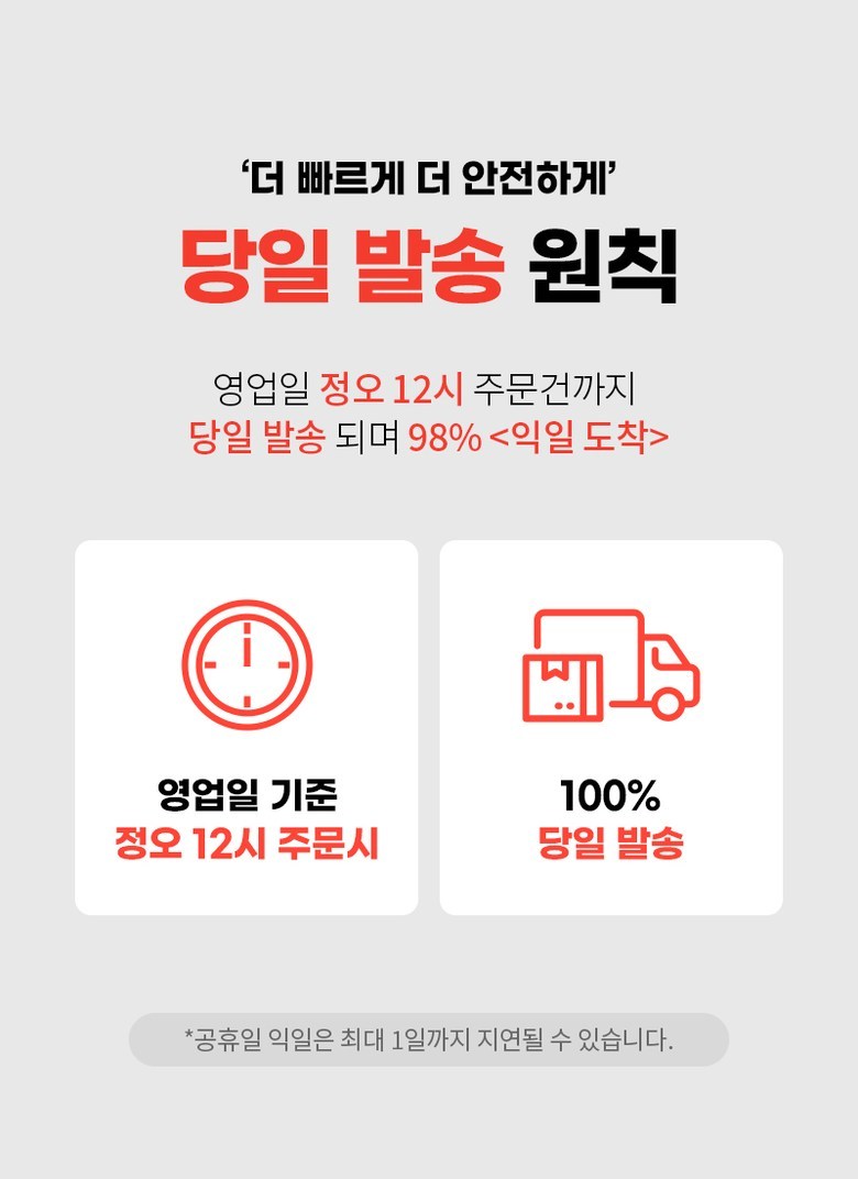 | 배송기간 | ㆍ도서산간 지역 등은 배송에 3-5일이 더 소요될 수 있습니다. - 천재지변, 물량 수급 변동 등 예외적인 사유 발생 시, 다소 지연될 수 있는 점 양해 부탁드립니다. | ||