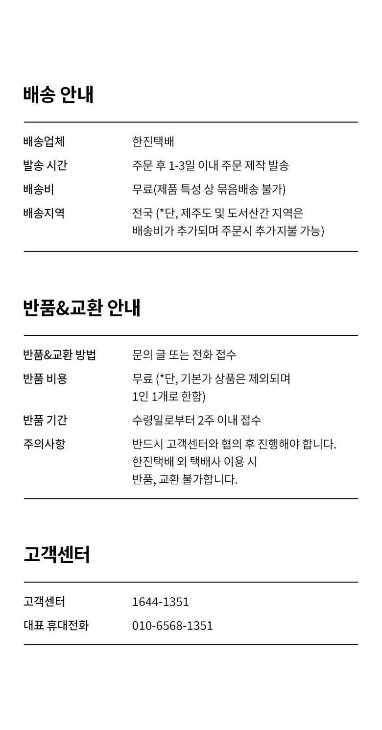 - ㆍ모니터 해상도의 차이로 인해 색상이나 이미지가 실제와 달라, 고객이 단순 변심으로 교환/반품을 무료로 요청하는 경우