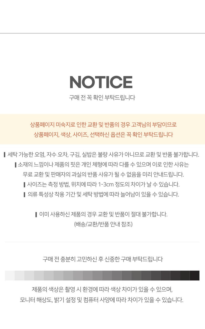 - ㆍ모니터 해상도의 차이로 인해 색상이나 이미지가 실제와 달라, 고객이 단순 변심으로 교환/반품을 무료로 요청하는 경우