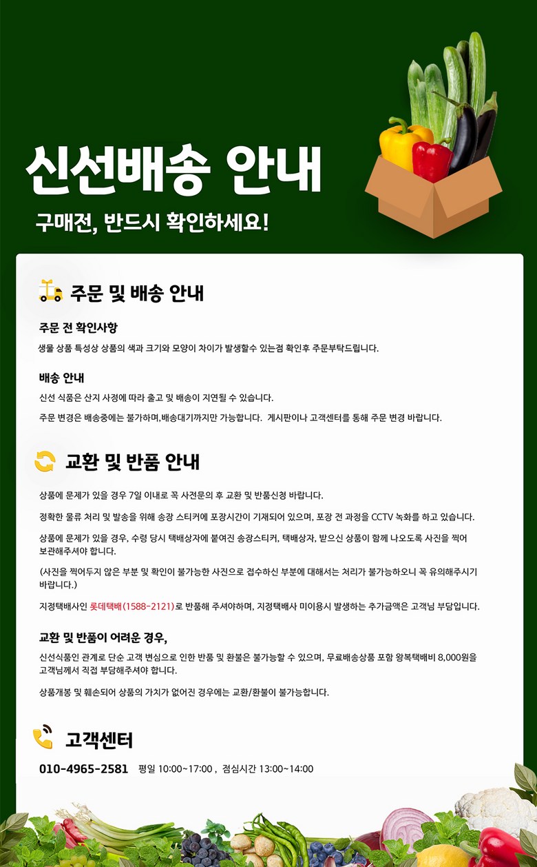 | 배송방법 | 신선/냉장/냉동 | 배송비 | 무료배송 - 도서산간 지역 배송불가 |