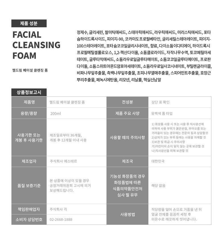 | 사용기한 또는 개봉 후 사용기간 | 제조일로부터 36개월,개봉 후 12개월 이내 사용 | 사용방법 | 적당량을 덜어 손으로 거품을 낸뒤얼굴 전체를 꼼꼼히 세정 후 미온수로 깨끗하게 씻어냅니다. |