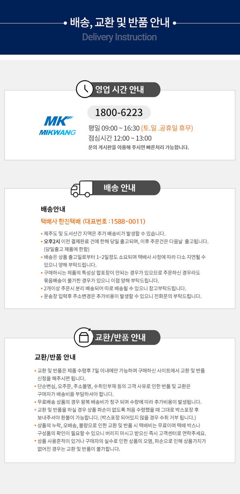 - ㆍ교환/반품에 관한 일반적인 사항은 판매자가 제시사항보다 관계법령이 우선합니다.