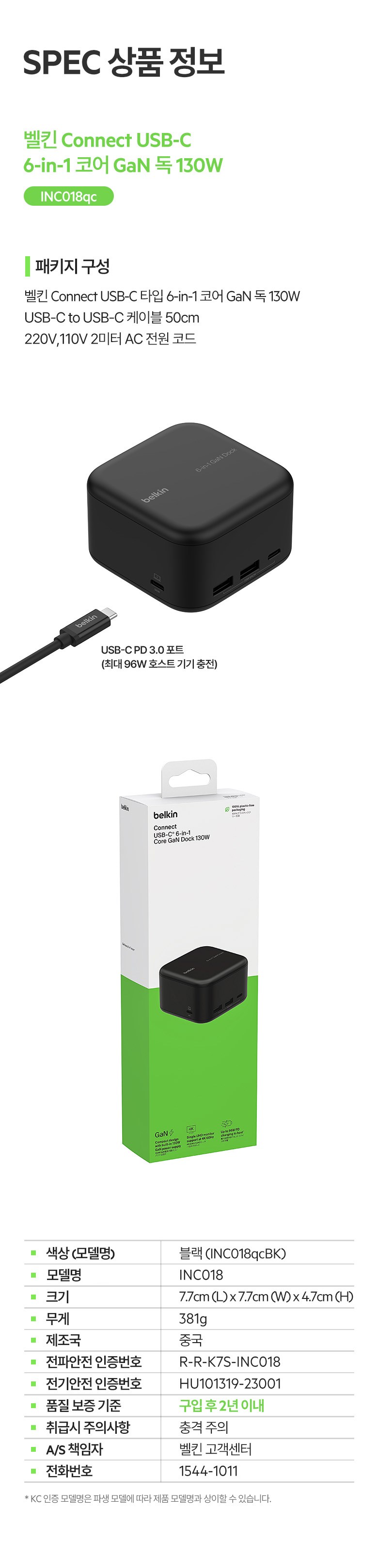 | 품명 및 모델명 | 벨킨 USB-C 6-in-1 코어 GaN 독 130W 맥북 프로 96W 충전/ INC018 | KC 인증정보 | HU101319-23001A, R-R-K7S-INC018 |
