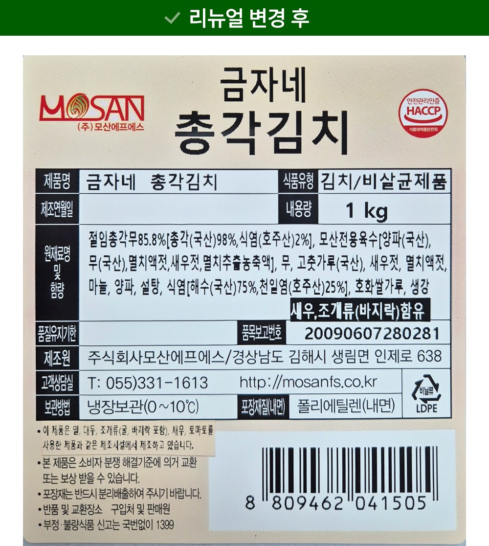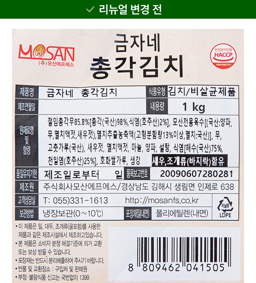 | 포장단위별 내용물의 용량(중량), 수량 | 1kg x 4개 | 원재료명 및 함량 | 컨텐츠 참조 |