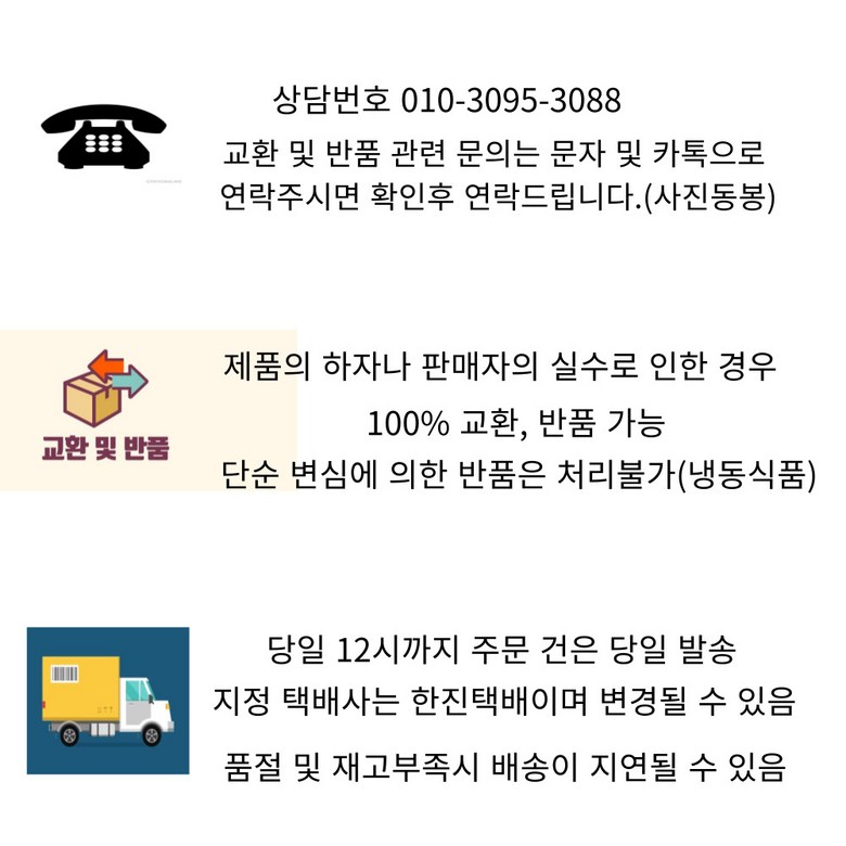 - ㆍ모니터 해상도의 차이로 인해 색상이나 이미지가 실제와 달라, 고객이 단순 변심으로 교환/반품을 무료로 요청하는 경우