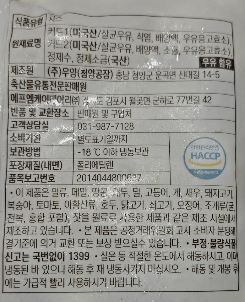| 생산자 및 소재지 | (주)우양(청양공장) / 충남 청양군 | 제조연월일, 소비기한 또는 품질유지기한 | 상품 상세페이지 참조 |
