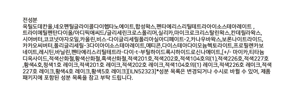 | 사용기한 또는 개봉 후 사용기간 | 본 상품은 해당 물류센터 직발송 상품인 관계로 제조연월일 및 사용기한 정보가 매번 변경되므로 상단 사용기한 정보를 참고해 주세요. | 사용방법 | 립브러시를 사용하여 바르거나 립스틱을 입술에 대고 그대로 발라줍니다. |