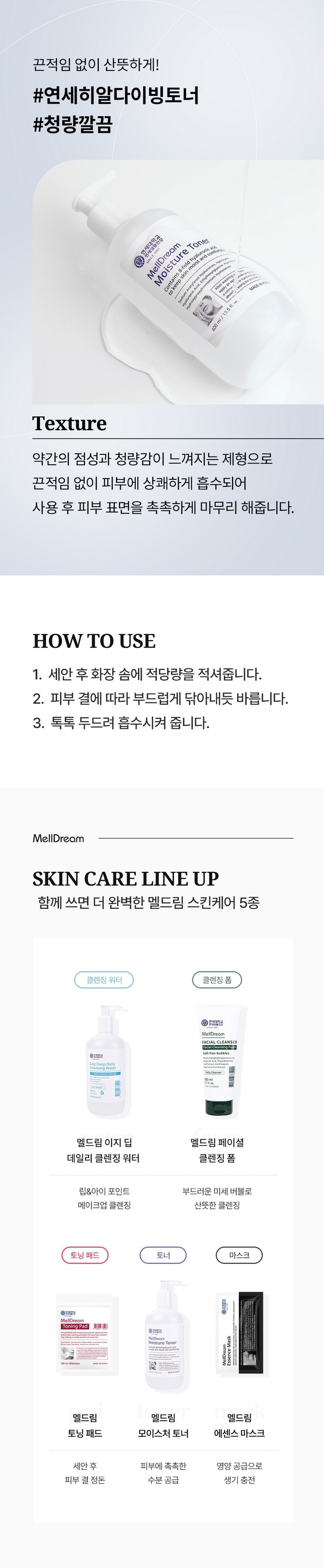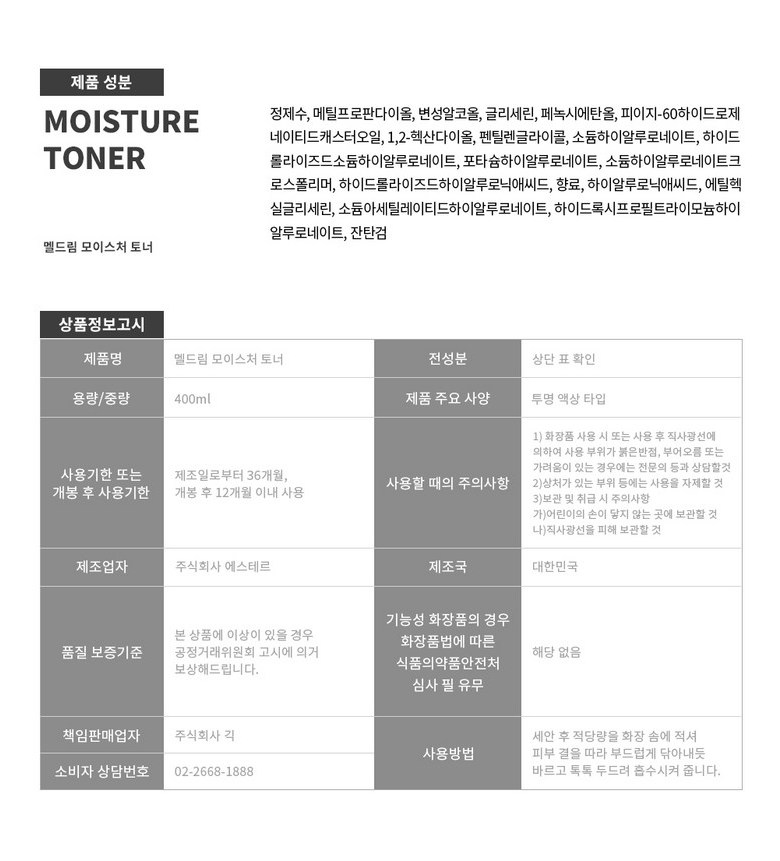 | 사용기한 또는 개봉 후 사용기간 | 제조일로부터 36개월,개봉 후 12개월 이내 사용 | 사용방법 | 세안 후 적당량을 화장 솜에 적셔 피부 결을 따라 부드럽게 닦아내듯 바르고 톡톡 두드려 흡수시켜 줍니다. |