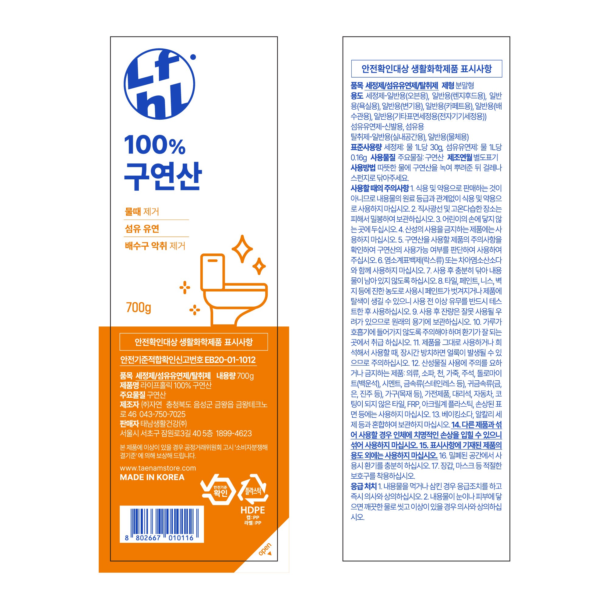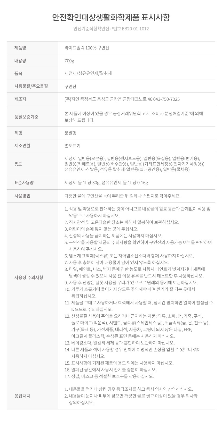 | 품목 및 제품명 | 세정제,탈취제,섬유유연제 / 라이프홀릭 100% 구연산 | 용도(표백제의 경우 계열을 함께표시) 및 제형 | 일반용-오븐용,일반용-렌지후드용,일반용-욕실용,일반용-변기용,일반용-카페트용,일반용-배수관용,일반용-기타표면세정용-전자기기세정용,일반용-실내공간용,일반용-물체용,신발용,섬유용 / 비분사형-분말형 |