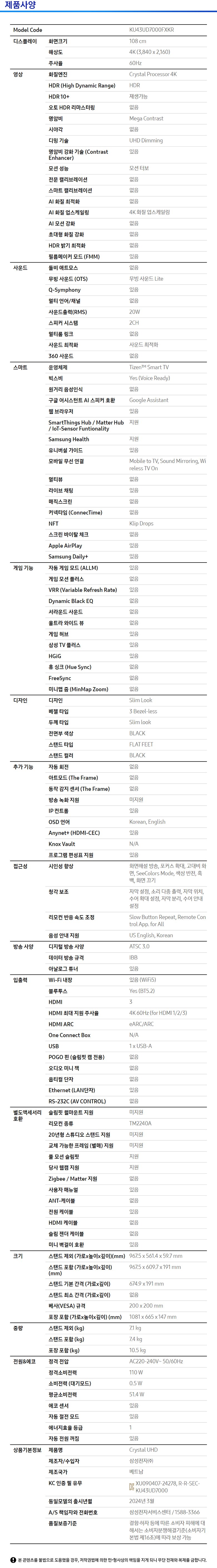 | 품명 및 모델명 | KU43UD7000FXKR | KC 인증정보 | 본품 : XU090407-24278, R-R-SEC-KU43UD7000, 무선기기 : R-C-SEC-WCD730M, 리모컨:R-C-SEC-VGTM2360E |