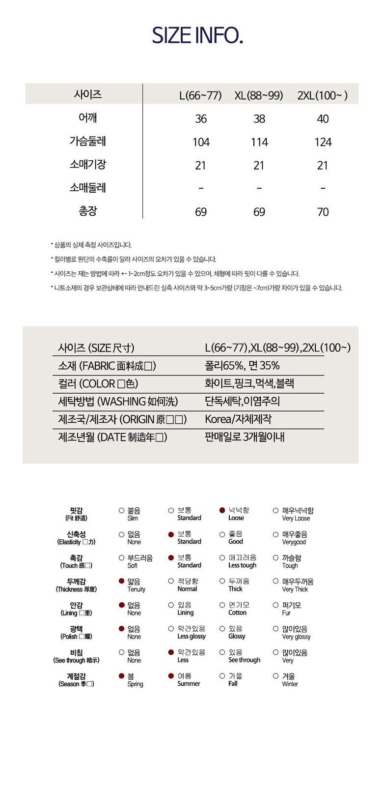 | 치수 | L(66~77),XL(88~99),2XL(100~) | 제조자(수입자) | 엔에스컴퍼니 |