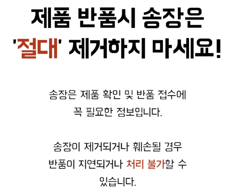 | 교환/반품 신청 기준일 | ㆍ단순변심에 의한 교환/반품은 제품 수령 후 7일 이내까지, 교환/반품 제한사항에 해당하지 않는 경우에만 가능 (배송비용과 교환/반품 비용 왕복배송비 고객부담) ㆍ상품의 내용이 표시·광고의 내용과 다른 경우에는 상품을 수령한 날부터 3개월 이내, 그 사실을 안 날 또는 알 수 있었던 날부터 |