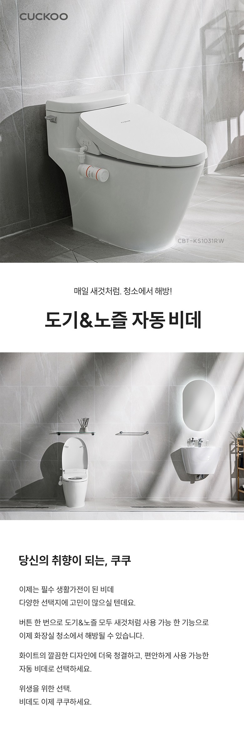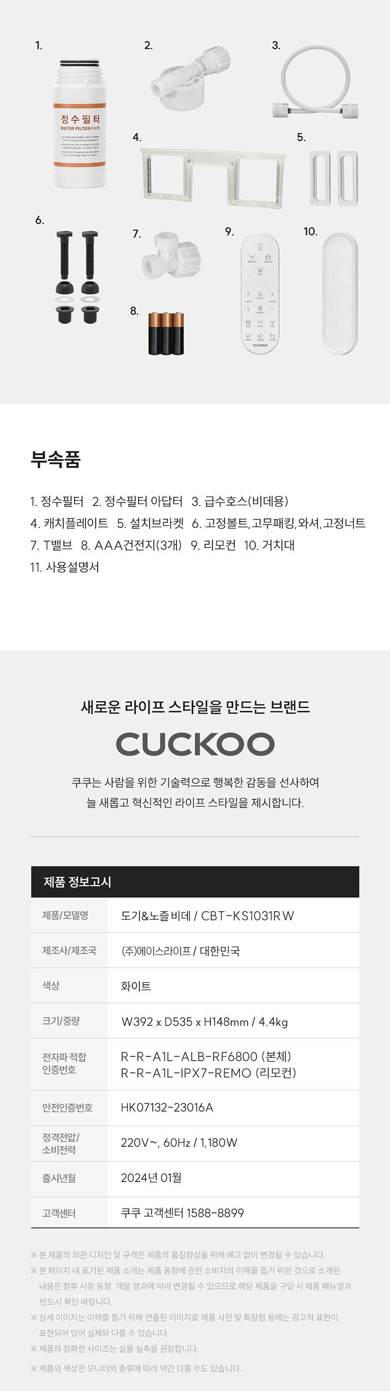| 품명 및 모델명 | 자동세정건조식변기 / CBT-KS1031RW | KC 인증정보 | 본품 : HK07132-23016A, R-R-A1L-ALB-RF6800 / 리모컨 : R-R-A1L-IPX7-REMO / 건전지 : B053R5023-20002 |