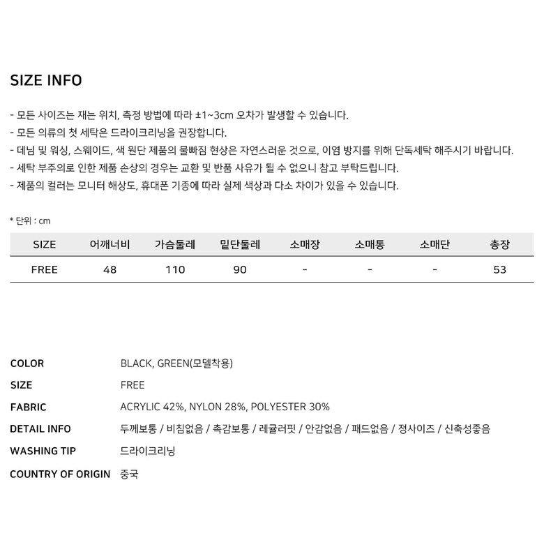 | 제품 소재 | 겉감 아크릴42% 나일론28% 폴리에스테르30% | 색상 | 그린,블랙 |