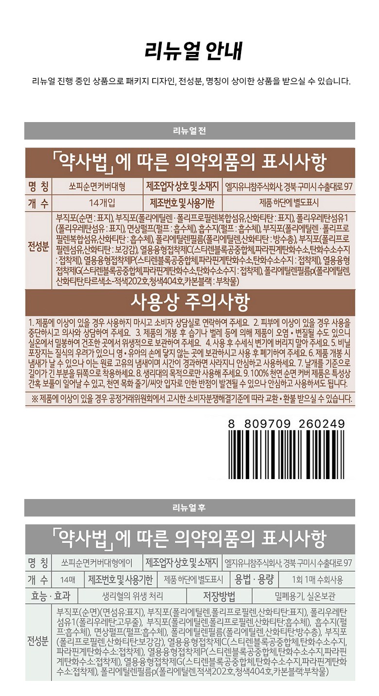 | 제조국(원산지) | 한국 | 제조자(수입자) | 엘지 유니참 주식회사 |
