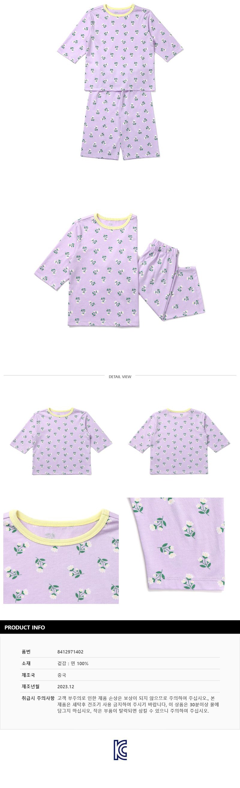 | 품명 및 모델명 | 래핑차일드 아동용 플라워 7부 상하세트 | KC 인증정보 | 유/KC마크 |