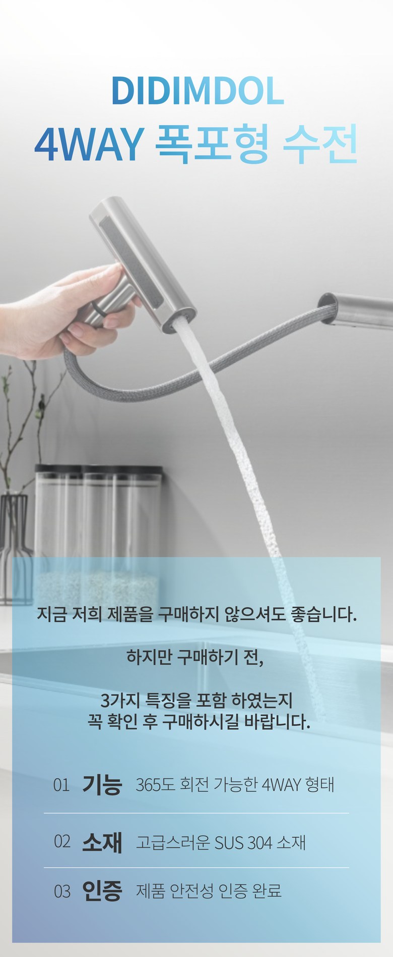 | 품명 및 모델명 | 디딤돌 폭포 수전 | 인증/허가 사항 | 한국물기술인증원 KCW-2022-0146 |