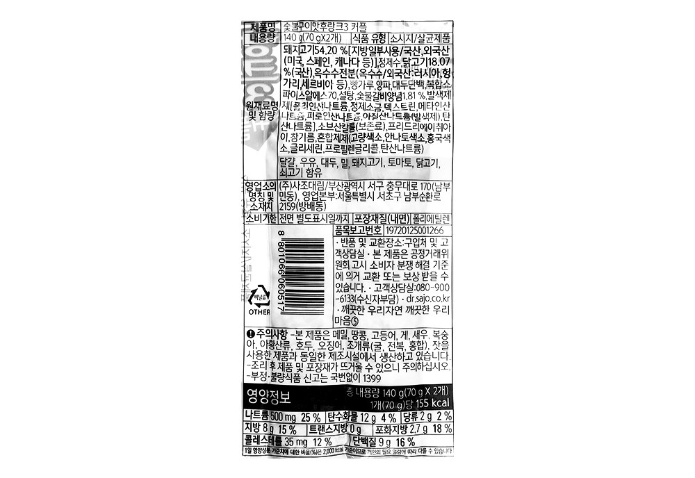 소시지 2개입으로 구성된 숯불구이맛 후랑크