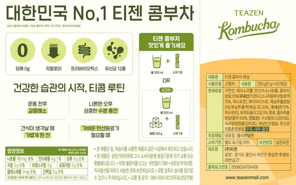| 포장단위별 내용물의 용량(중량), 수량 | 5g*50개 | 원재료명 및 함량 | 컨텐츠 참조 |