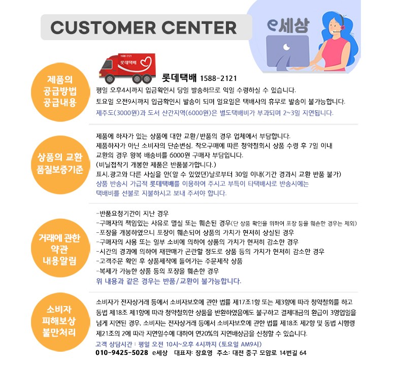 - ㆍ교환/반품에 관한 일반적인 사항은 판매자가 제시사항보다 관계법령이 우선합니다.