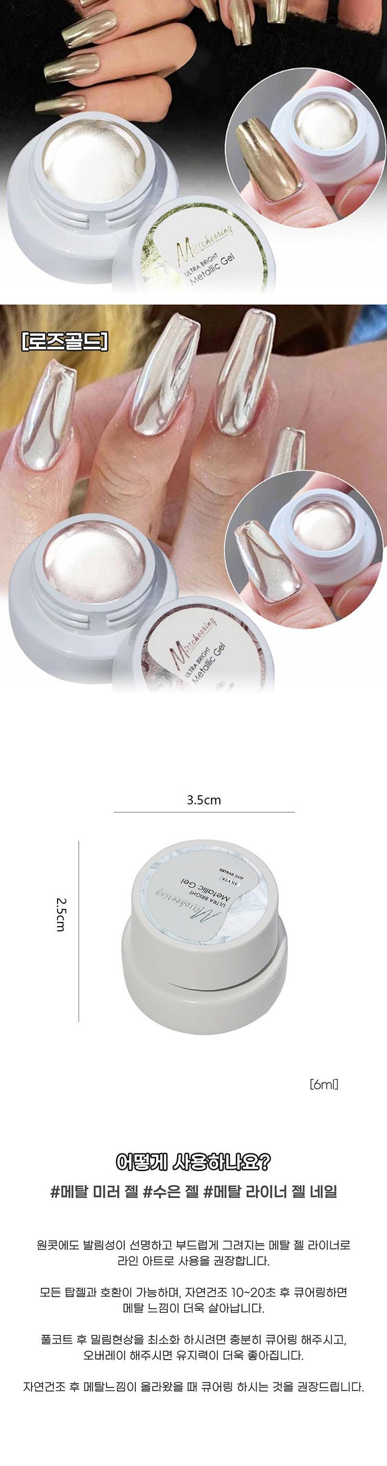 | 품명 및 모델명 | 품명:젤 네일 / 모델명:메탈 미러 수은 젤 라이너 네일 6ml | 인증/허가 사항 | 법에 의한 인증·허가 등을 받았음을 확인할 수 있는 경우 그에 대한 사항:해당사항없음 |