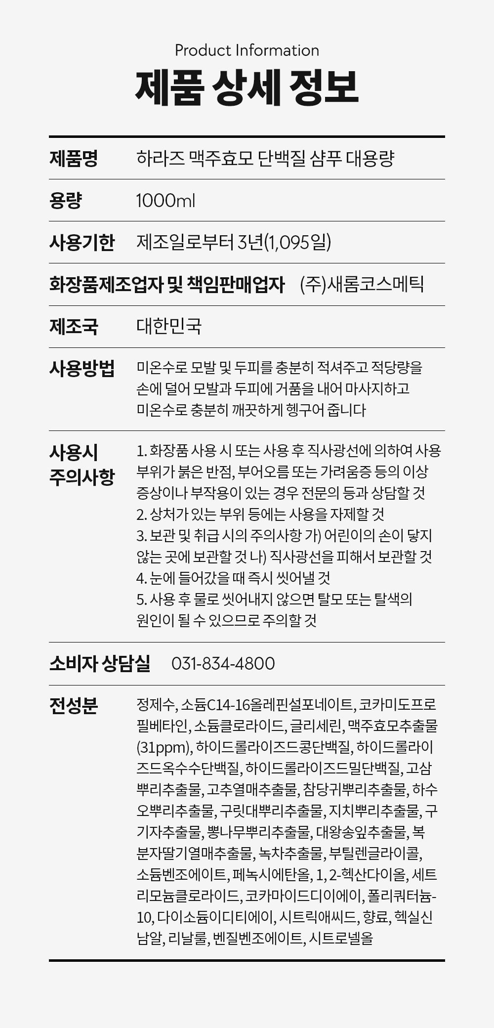 | 용량(중량) | 1000ml | 제품 주요 사양 | 모든 모발용 |