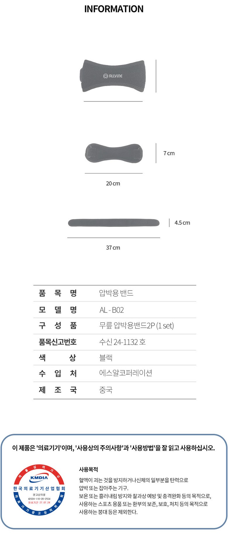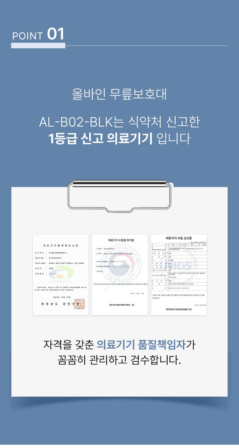 | 품명 및 모델명 | 올바인 무릎보호대 (AL-B02-BLK) | 허가∙인증∙신고번호 (의료기기법에 따른 허가∙인증∙신고 대상 의료기기에 한함) | 수신 24-1132 호 |
