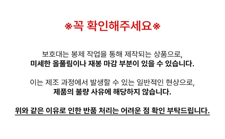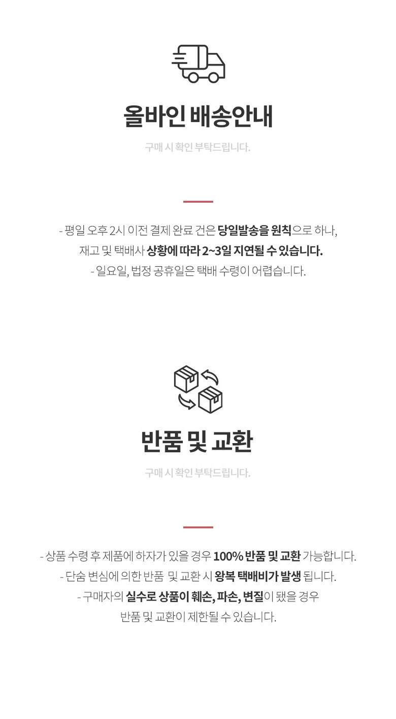 - ㆍ모니터 해상도의 차이로 인해 색상이나 이미지가 실제와 달라, 고객이 단순 변심으로 교환/반품을 무료로 요청하는 경우