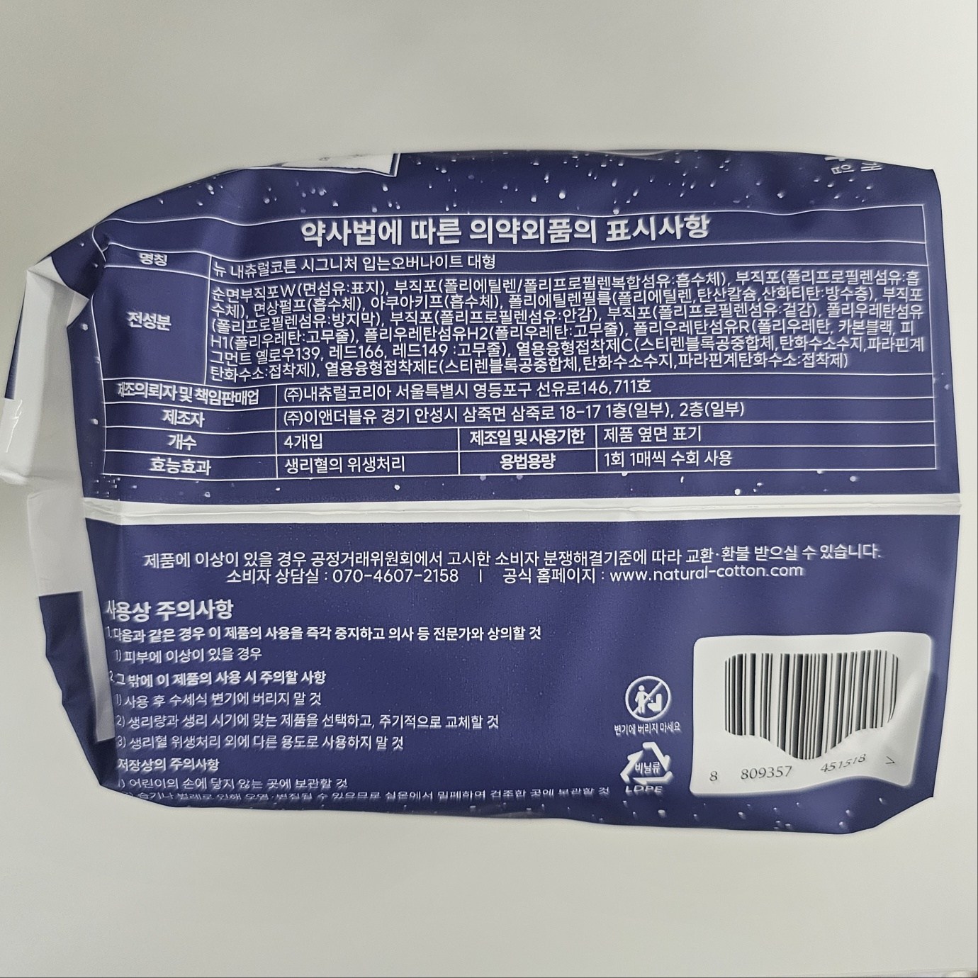 | 품명 및 모델명 | 뉴 내츄럴코튼 시그니처 입는오버나이트 대형 | 인증/허가 사항 | 의약외품 |